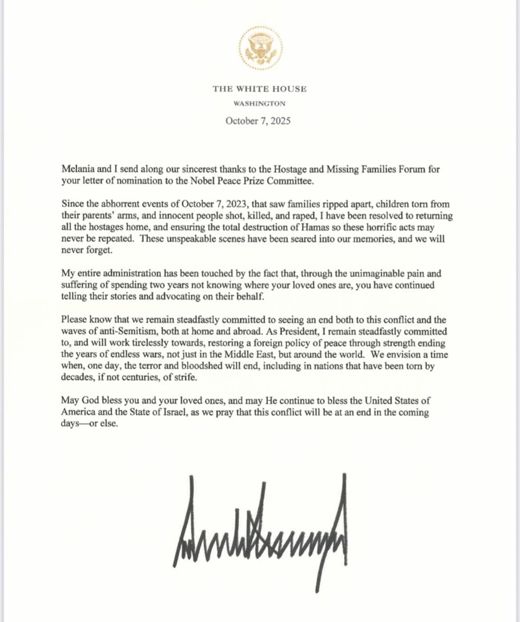 - טראמפ שלח את המכתב ביום השנה לטבח 7 באוקטובר כדי להודות לפורום בני משפחות החטופים על מכתב ההמלצה ששיגרו לוועדת פרס נובל לשלום ובו המליצו כי הנשיא טראמפ יקבל את הפרס על פועלו להחזרת החטופים וסיום המלחמה בעזה.