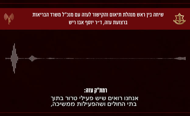 בהקלטה שנחשפה נשמע ראש מנהלת התיאום והקישור (רמת"ק) של עזה משוחח על הנושא עם מנכ"ל משרד הבריאות ברצועה. "אנחנו רואים שארגון הטרור חמאס ממשיך את הפעילות הצבאית שלו בתוך בתי החולים", אמר הרמת"ק. "אנחנו מוכנים לספק כל סיוע המוניטרי שיידרש. הבקשה שלנו היא פשוטה, הפסקה מיידית של כל פעילות הטרור בבתי החולים, כמו שראינו בבית החולים בח'אן יונס".