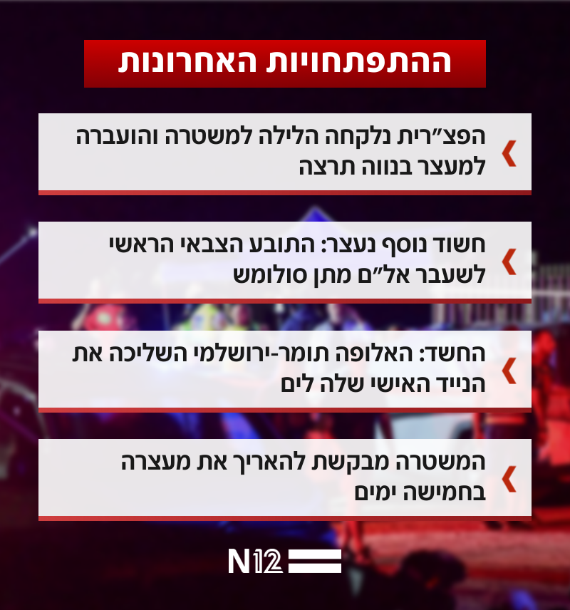 13:18 - המשטרה ביקשה להאריך את מעצרו של אל"ם סולומש ב-5 ימים, השופטת מאשרת 3 בחשד לשיבוש מהלכי משפט והפרת אמונים: "קיימת עוצמת מסוכנות בהתחשב בסעיפי החשדות".