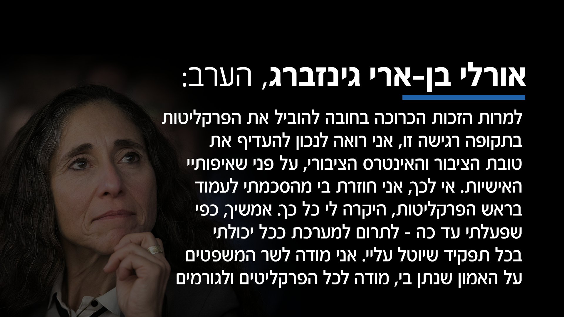 "הניסיון להפוך את הבחירה בי לעניין פוליטי ולהציגו כחלק ממהלך שנועד לפגוע בשלטון החוק, או בעצמאות שיקול הדעת של הפרקליטות – הוא מצער וסותר את התנהלותי וערכיי מאז או מתמיד", המשיכה בן ארי גינזברג. "האווירה שנוצרה מאיימת לפגוע באמון הציבור בפרקליטות ולשחוק אותו עוד יותר. אינני מוכנה שעל גבי תיגרם למערכת המשפט פגיעה נוספת, כל עוד בכוחי למנעה".