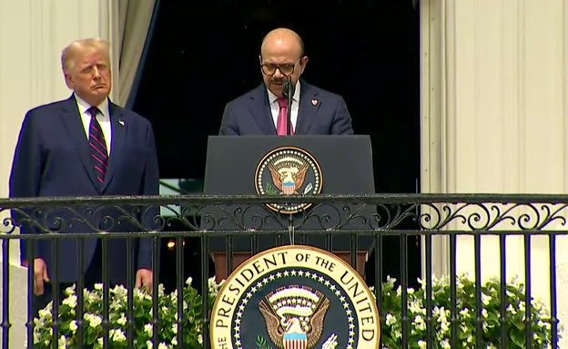 זמן קצר לפני הטקס הגיעו ראש הממשלה נתניהו ורעייתו שרה למתחם הבית הלבן, והתקבלו על ידי הנשיא טראמפ ומלניה. שני המנהיגים והרעיות היו ללא מסכות על פניהם, אך נמנעו ממגע ומלחיצת ידיים. במהלך הפגישה בין המנהיגים, העניק הנשיא טראמפ לנתניהו את מפתח הבית הלבן והחמיא לראש הממשלה: "אתה מנהיג מדהים במשך תקופה ארוכה".