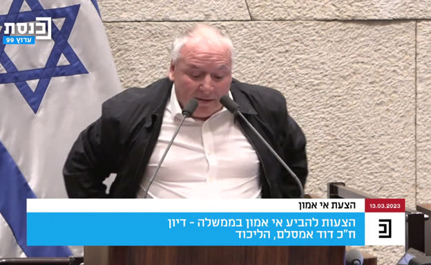 לפני תחילת ההצבעות על החוקים של הקואליציה, המליאה התכנסה להצבעת אי-אמון בממשלה. שם, השר במשרד המשפטים דוד אמסלם תקף את המפגינים נגד המהפכה המשפטית: "ראיתי 50 אנרכיסטים שחסמו את הכביש, למה? בא להם! רוצים לסגור את נמל התעופה, בא להם".
