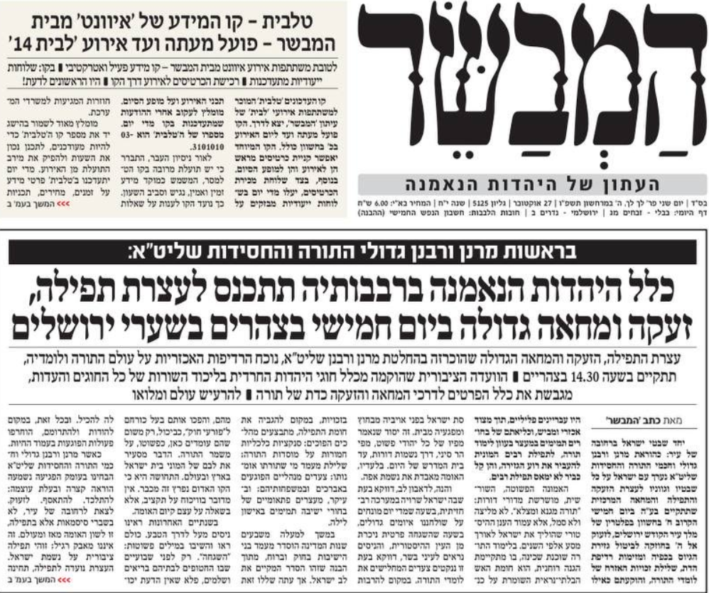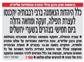 עצרת התפילה של החרדים ביום חמישי היא מבחינתי כנגד מי שעושה הכל כדי לחבל, להזיק ולפלג. לפיד, ליברמן, היועמ״שית המודחת וחבר מרעיה ושופטי בג״צ. זו הנקודה המרכזית. ובנקודה הזו אני מלא מלא עם אחינו החרדים.