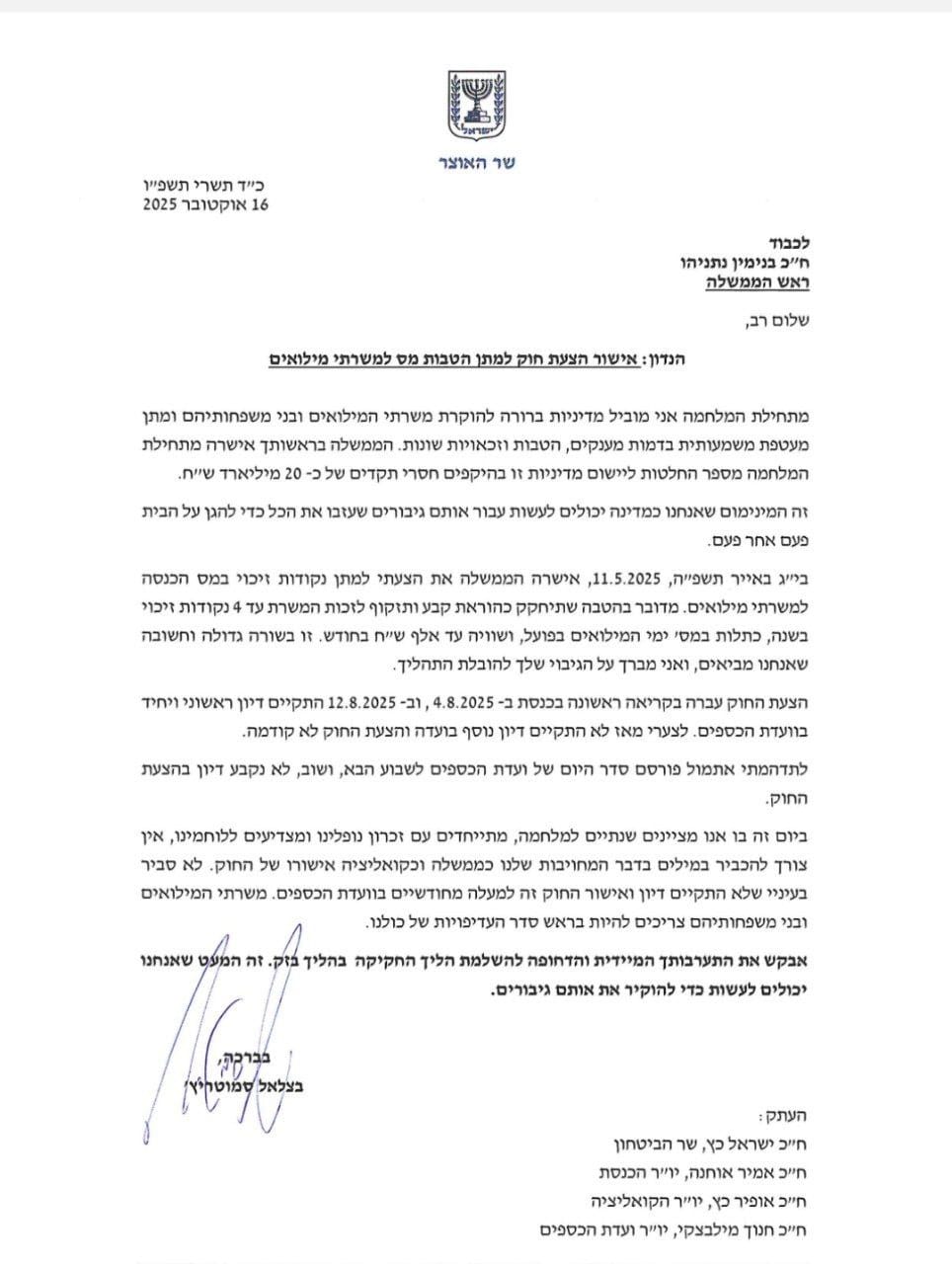 - לפני כ-3 שבועות, ב-16 באוקטובר, שלח סמוטריץ' מכתב זועם לרה"מ - בשל ההחלטה של יו"ר ועדת הכספים חנוך מילביצקי שלא לקדם את ההצעה: "זה המינימום שאנחנו כמדינה יכולים לעשות עבור אותם גיבורים שעזבו את הכול כדי להגן על הבית פעם אחר פעם. אבקש את התערבותך המיידית להשלמת הליך החקיקה בהליך בזק".