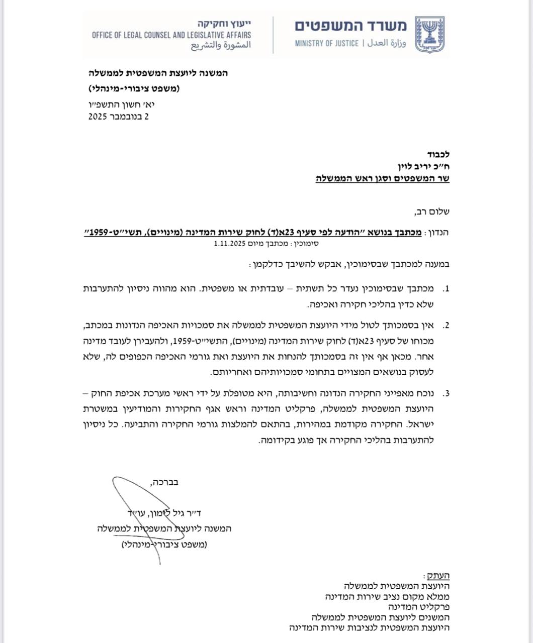 שר המשפטים יריב לוין דחה על הסף את דברי היועמ"שית. "מיארה על פניו נמצאת בניגוד עניינים חריף, כפי שעולה בבירור מהמכתב, וצריכה להימנע מכל עיסוק בחקירה. ככל שיש לה טענה שהיא לא הייתה מעורבת בכל שלב בנושא הזה, ראוי שהיא תאמר זאת באופן ברור. העובדה שהיא לא כתבה את זה במכתב, מעידה חד-משמעית על קיומו של ניגוד עניינים".